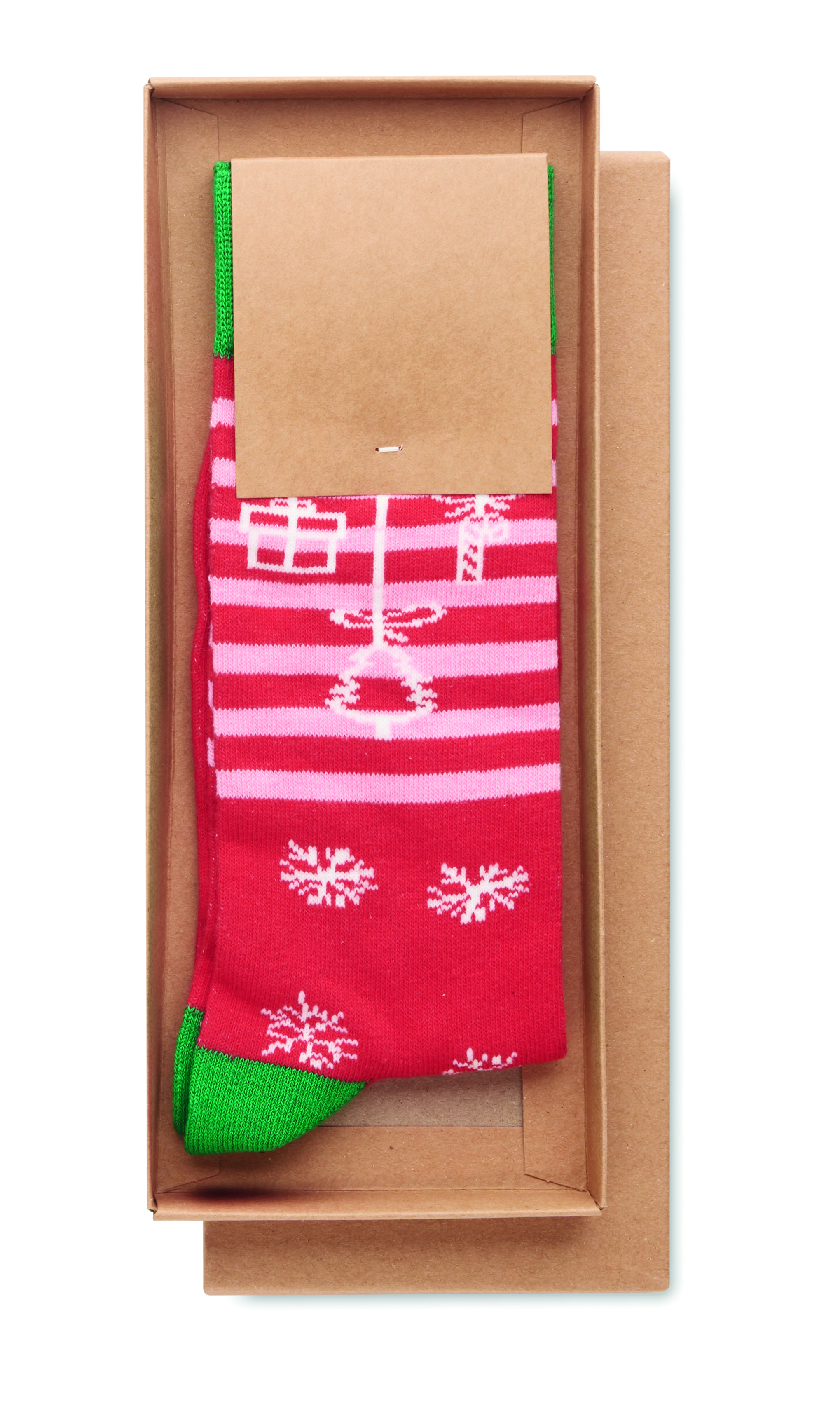 Socken mit weihnachtlichem Muster. 75% Baumwolle, 23% RPET-Polyester, 2% Elasthan. Lieferung in Geschenkbox. Größe L entspricht 43-46.