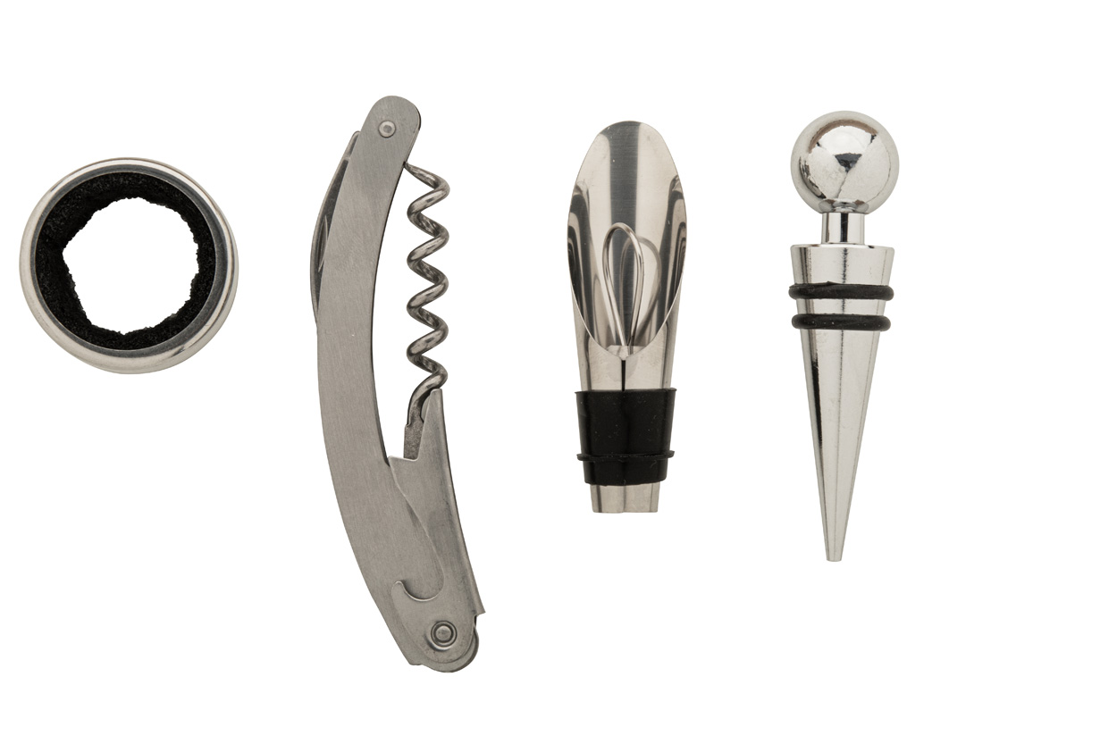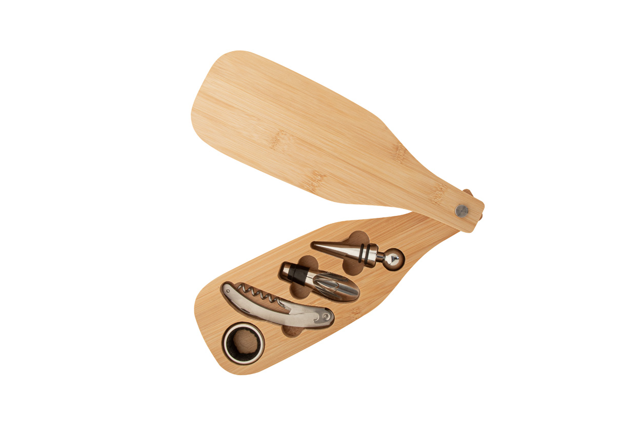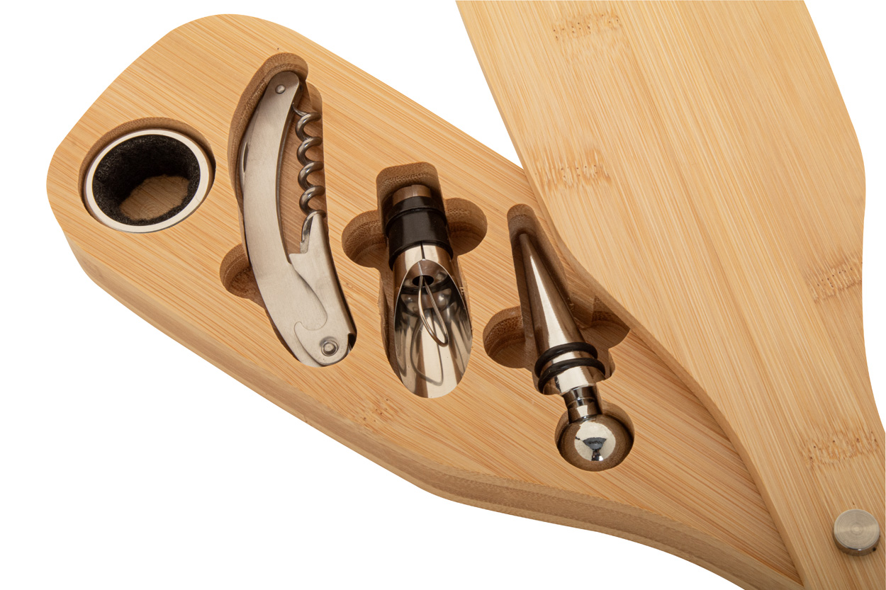 Weinset aus Edelstahl in einer flaschenförmigen Bambusbox, beinhaltet Korkenzieher, Tropfenstopper, Düse und Stopfen.