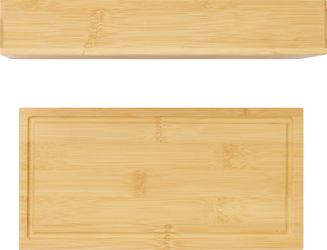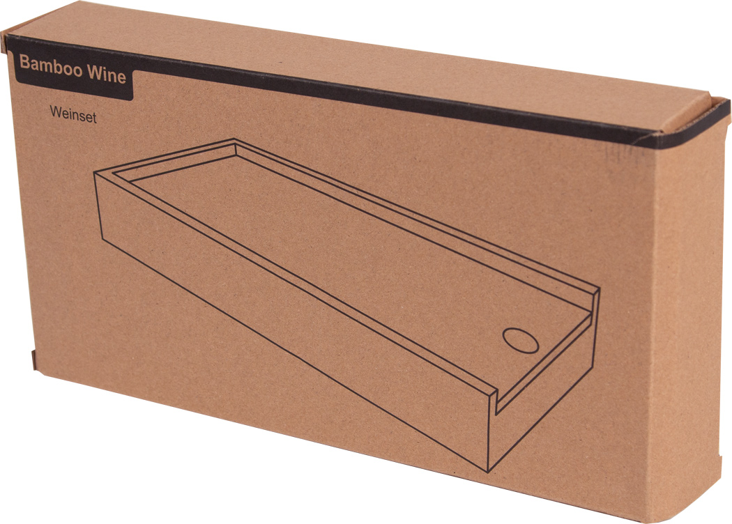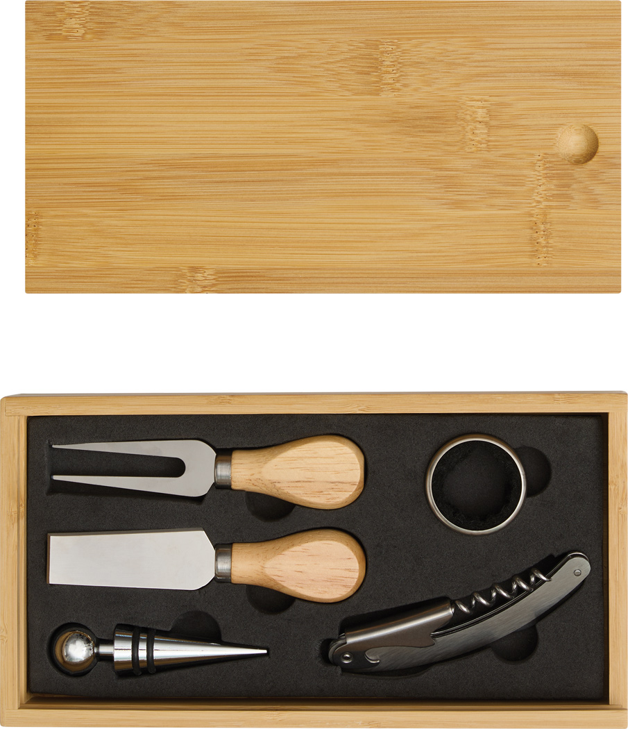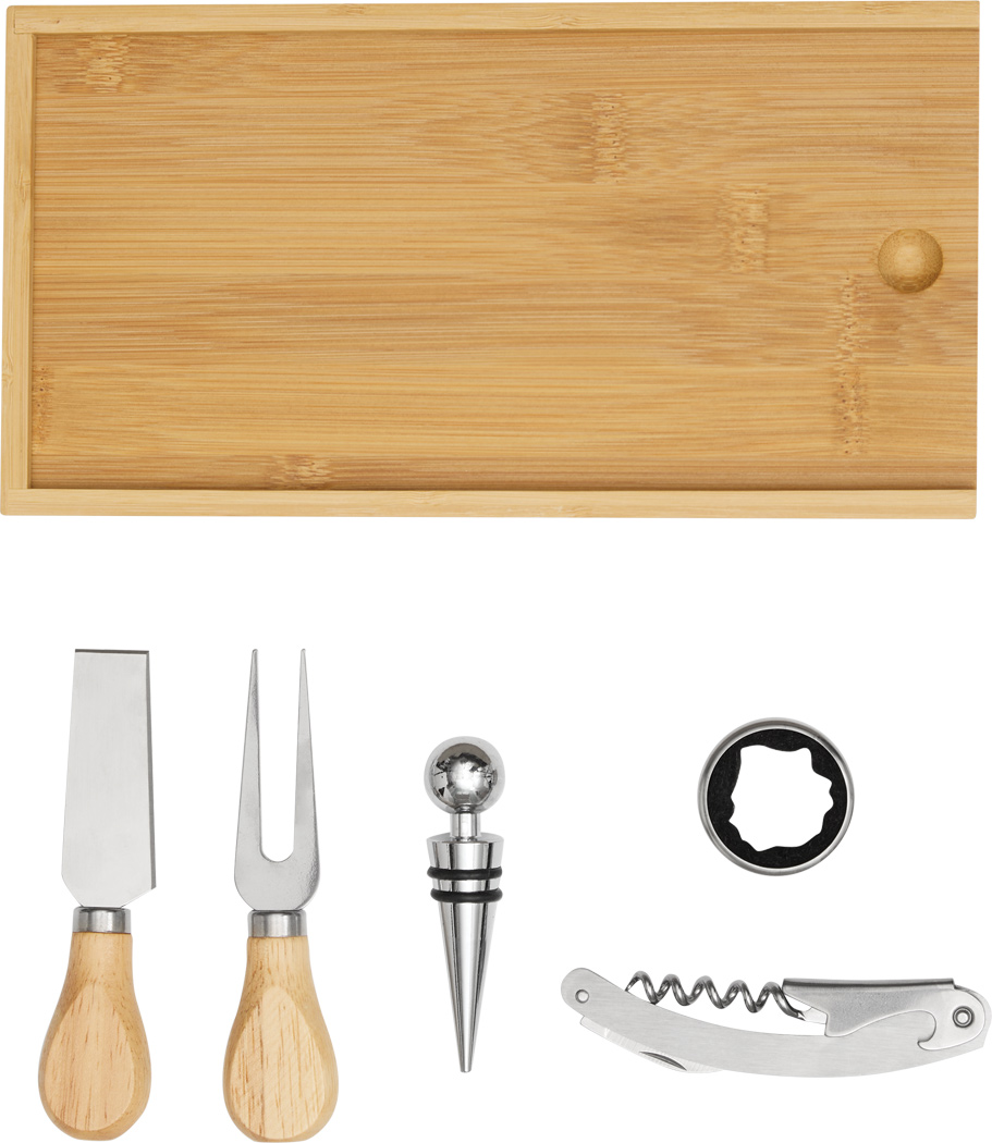 Wein- und Käseset BAMBOO WINE, in Bambus-Box, 6-teilig: bestehend aus Edelstahl-Tropfring, Metall-Flaschenverschluss, Edelstahl-Kellnermesser, Käsemesser und Gabel mit Holzgriff, Rückseite des Deckels als Schneidebrett nutzbar, in Box