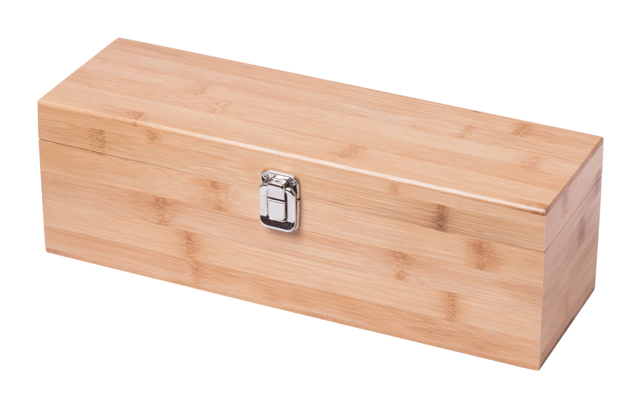 Bambus-Weinset mit Korkenzieher, Tropfring, Ausgießer und Flaschenverschluss in Bambusbox mit Platz für eine Weinflasche (exkl. Weinflasche).