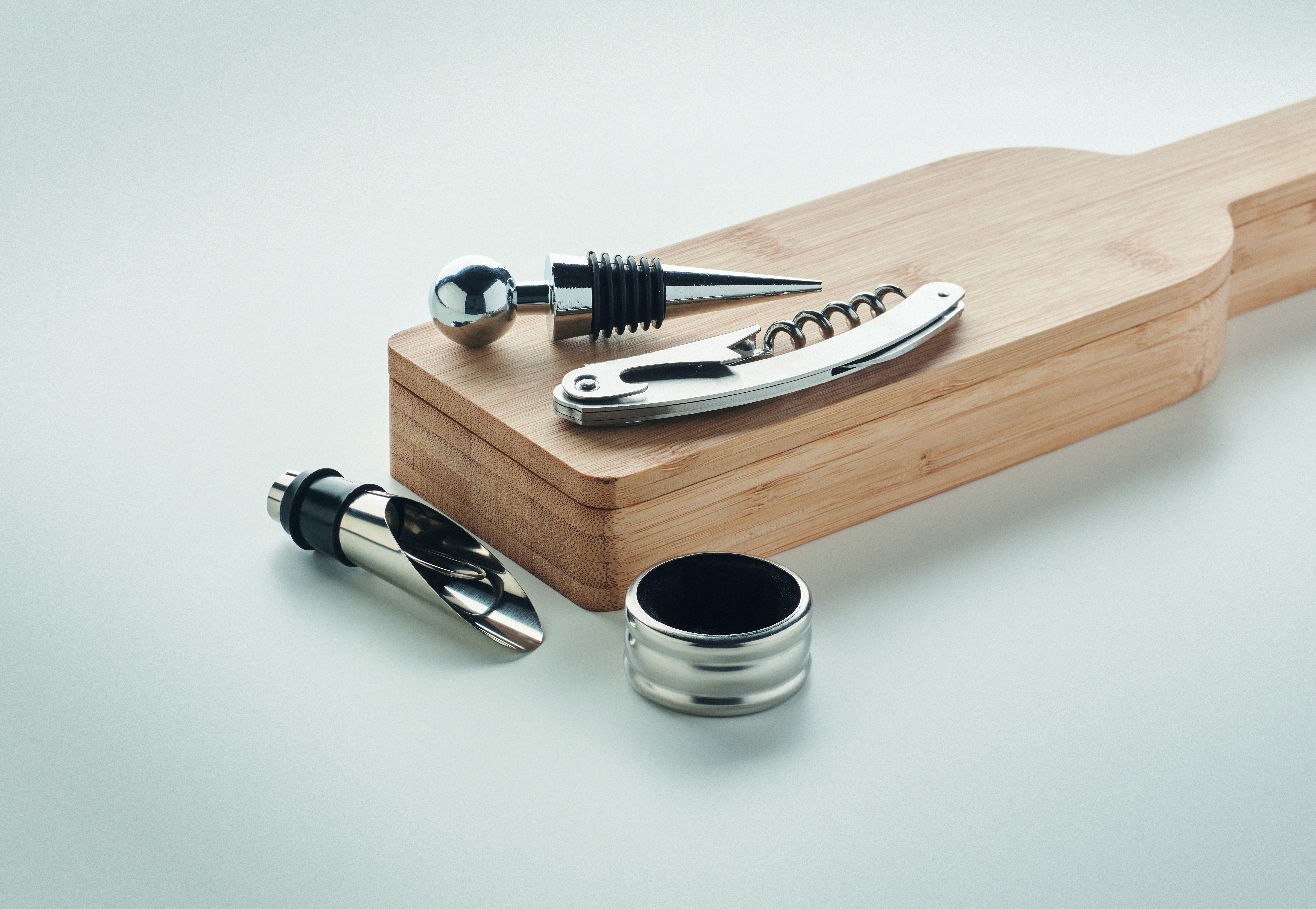 Weinset in Form einer Flasche. Inklusive Korkenzieher, Flaschenverschluss, Weinkragen und Ausgießer. Box aus Bambus.