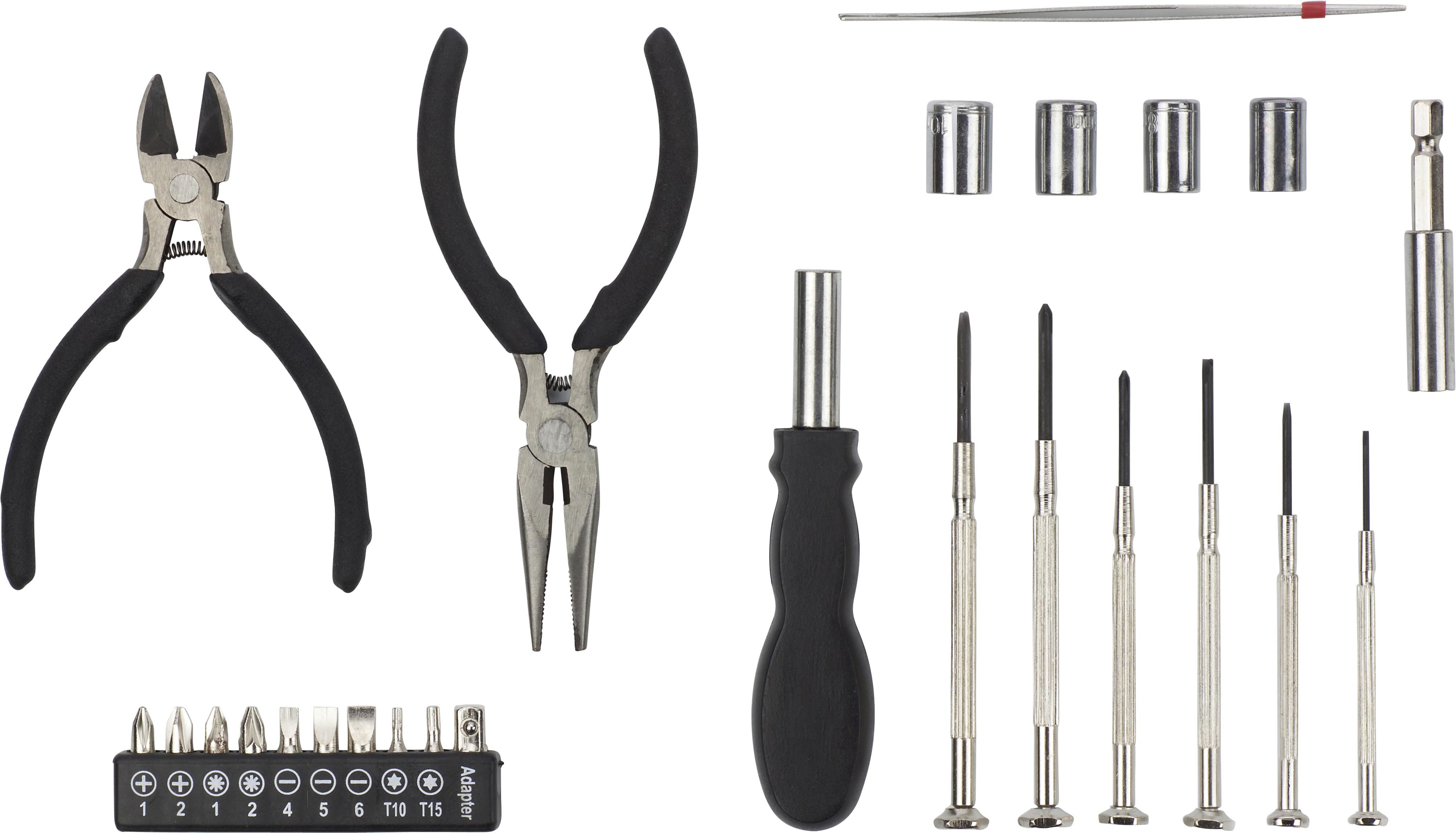Werkzeug-Set bestehend aus Seitenschneider, Flachzange, Bit-Set (10-tlg.), Pinzette, Schraubendreher, 4 Metall-Nüssen, 6 Feinmechaniker-Schraubendrehern, inklusive Metallbox.