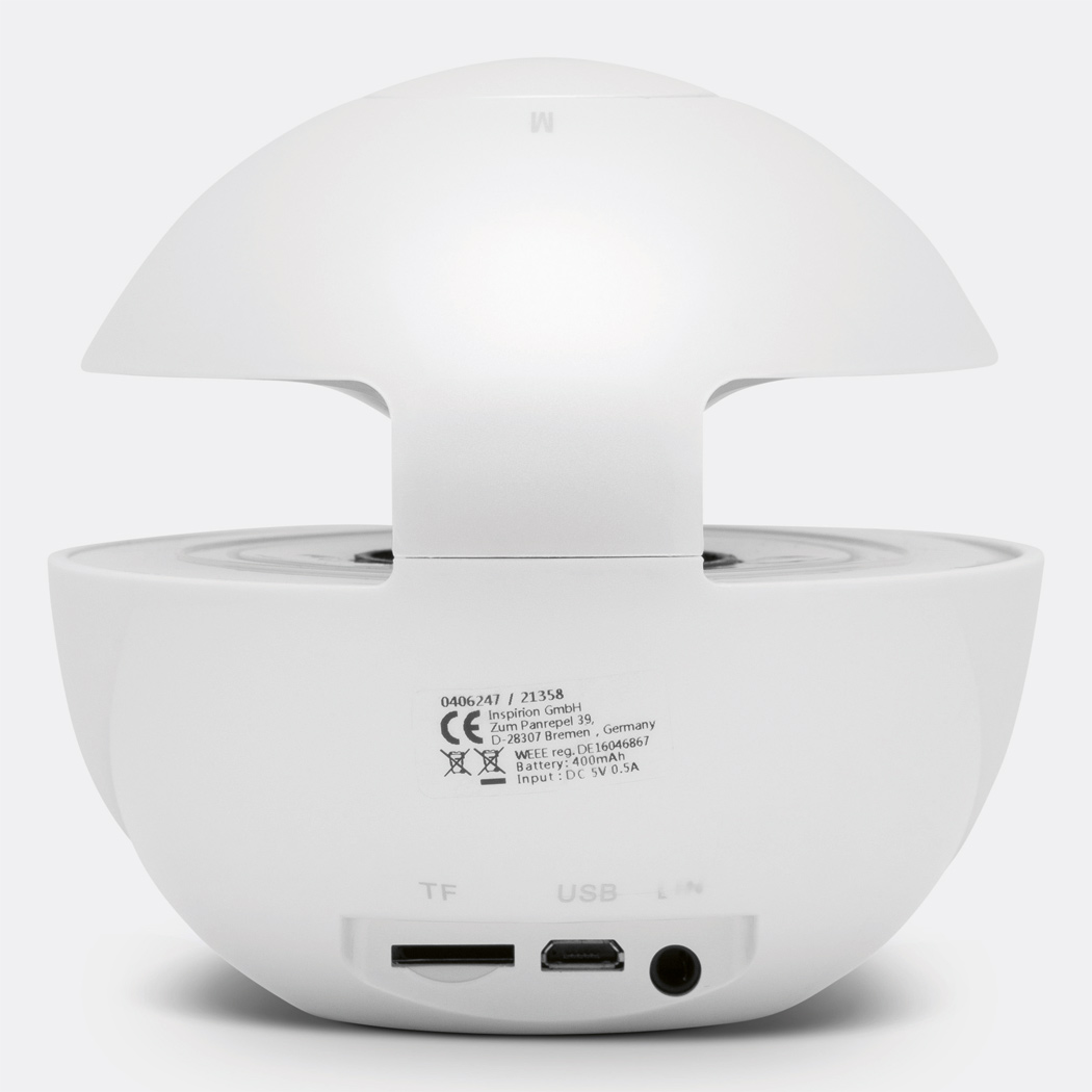 Wireless-Lautsprecher WONDER BALL MINI: farbwechselndes Licht während der Wiedergabe, Musikleistung 3 Watt, zur Koppelung mit wireless-fähigen Geräten, Reichweite: ca. 10 m, kompatibel zu Bluetooth®, auch andere externe Geräte über Line-In-Anschluss 3,5 mm Klinke (Kabellänge: ca. 53 cm) anschließbar, Slot für Micro-SD-Karten, mit Freisprechfunktion, Frequenzbereich: 20Hz-20KHz, aufladbarer Akku, Kapazität: 400 mAh, USB-Ladekabel mit Micro-USB-Stecker (Länge: ca. 53 cm), Touch-Bedientasten oben, An- und Ausschalter, Anti-Rutsch-Beschichtung am Boden
